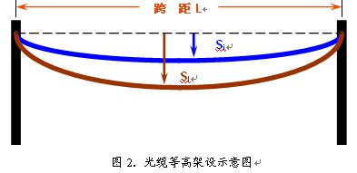 當光纜的氣象條件確定后,可以按照客戶要求的跨距和芯數(shù)進行設計了.ADSS光纜有等高和不等高架設兩種方式,圖2為等高架設時光纜的懸掛情況.