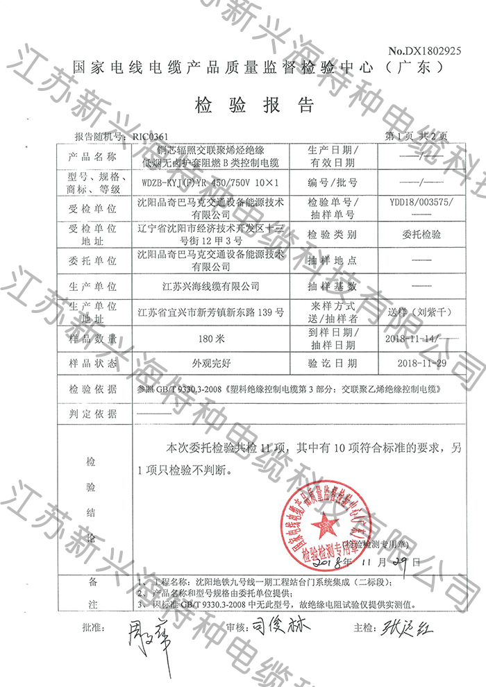 銅芯耐熱125℃交聯(lián)聚烯烴絕緣低煙無鹵軌道交通車輛用電線電纜檢測報告